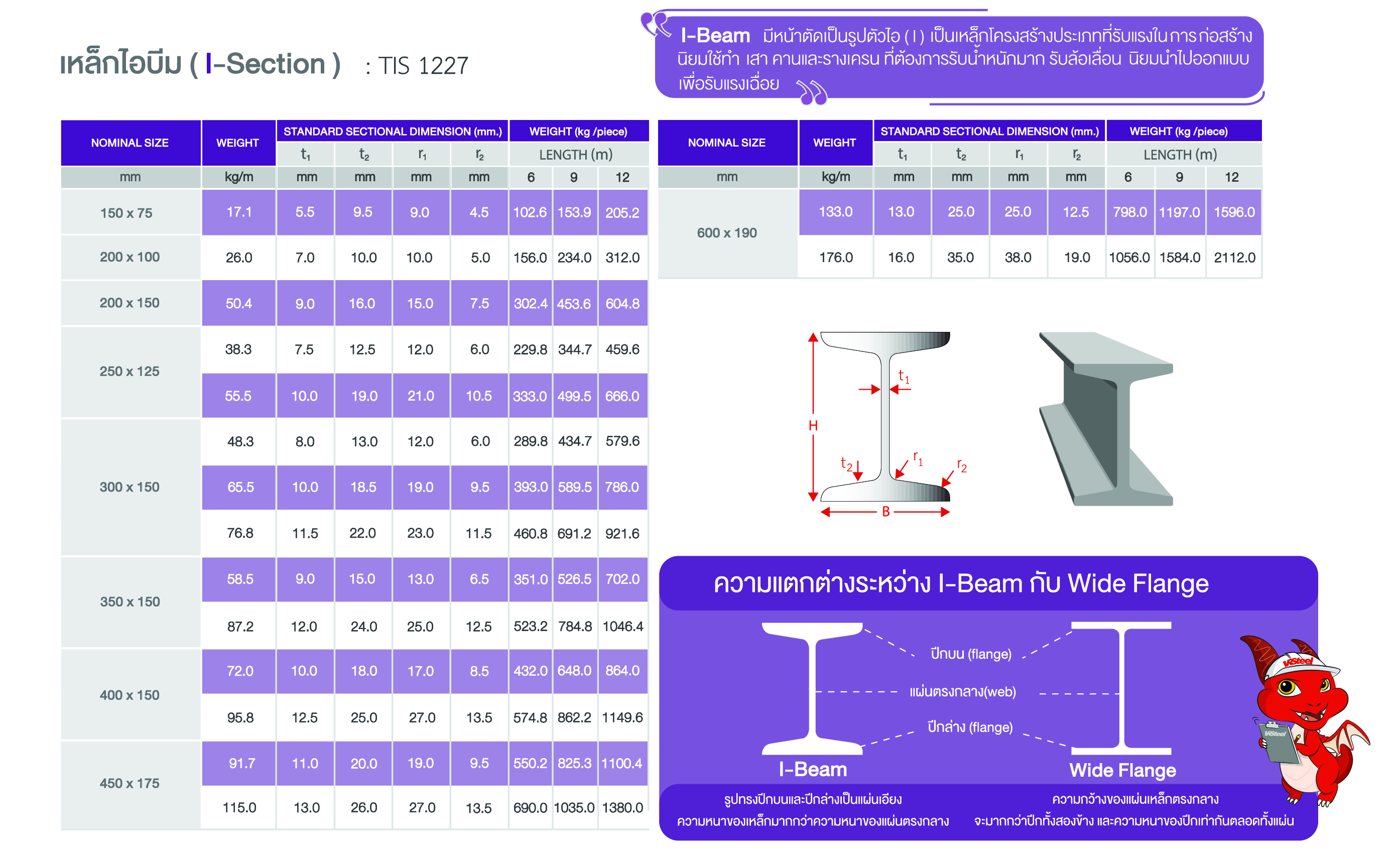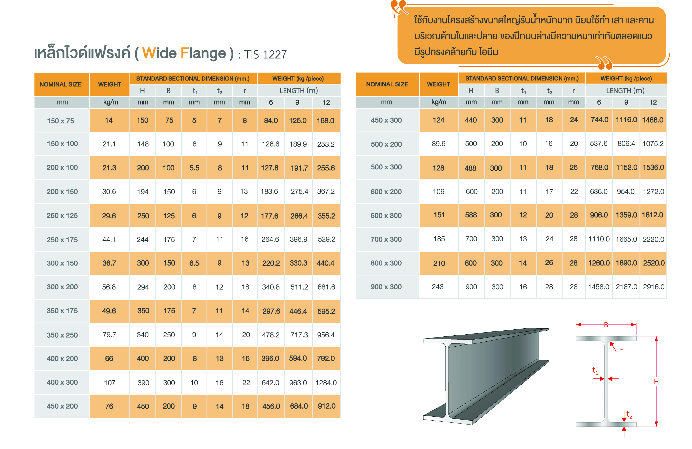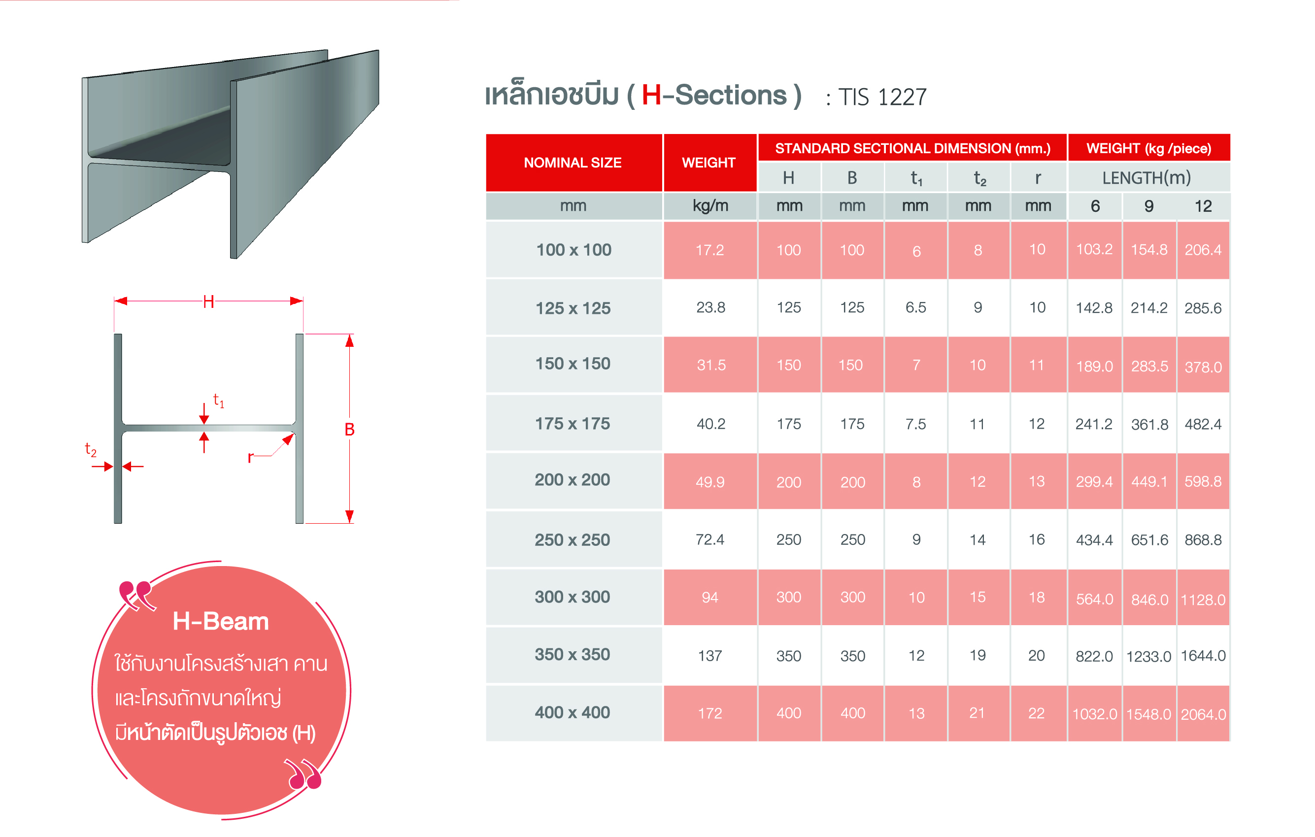 √ เหล็กเอชบีม (H beam) , เหล็กไวด์แฟรงค์ (Wide Flange) ลักษณะการใช้งานเหมือนกัน โดยนิยมนำไปใช้งาน เสา คาน และงานโครงสร้างอาคารที่มีขนาดใหญ่