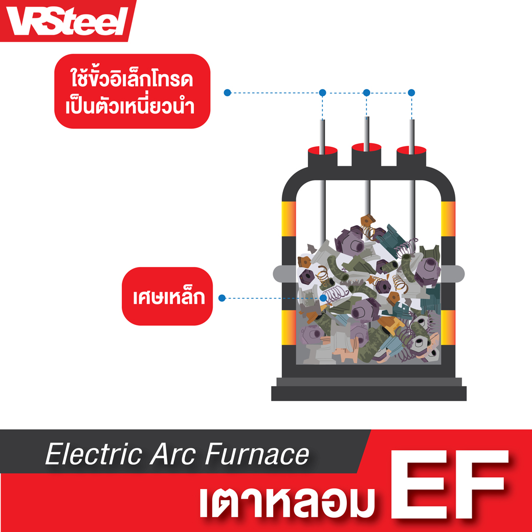 เตา EF ใช้ เศษเหล็กเป็นวัตถุดิบหลัก แล้วใช้ ไฟฟ้ากระแสแรงสูงผ่านอิเล็กโทรด เพื่อหลอมให้เหล็กละลาย กระบวนการนี้สามารถควบคุมอุณหภูมิและส่วนผสมทางเคมีได้อย่างแม่นยำ ทำให้ได้เหล็กที่มีคุณสมบัติเทียบเท่ากับเหล็กจากสินแร่ อีกทั้งยังช่วยลดการใช้ทรัพยากรธรรมชาติ และเป็นมิตรต่อสิ่งแวดล้อมมากกว่า เพราะเป็นการ “รีไซเคิลเหล็กเก่า” กลับมาใช้ใหม่อย่างมีประสิทธิภาพ
