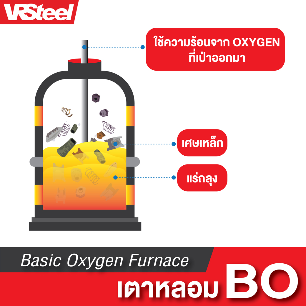 เตา BO ใช้เหล็กถลุงจากสินแร่ผสมกับเศษเหล็ก แล้วใช้ลมออกซิเจนบริสุทธิ์เป่าเข้าไปในเหล็กหลอมเหลว เพื่อลดปริมาณคาร์บอนและสิ่งเจือปน กระบวนการนี้มักใช้ในโรงงานขนาดใหญ่ ที่มีกำลังการผลิตสูงและมุ่งเน้นเหล็กคุณภาพ